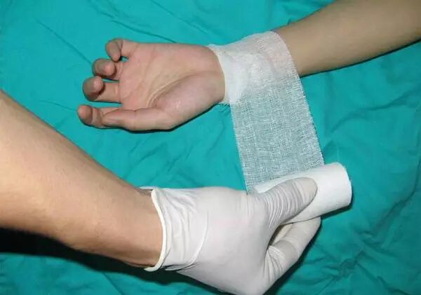 用绷带或其他乾净的布把布垫包紧在伤口上。若血液浸透了绷带,不要拆去那绷带,只须在伤口上加上另一个布垫及扎上新绷带即可。