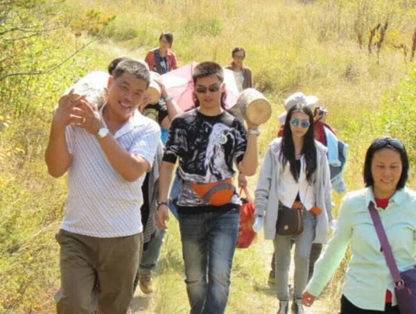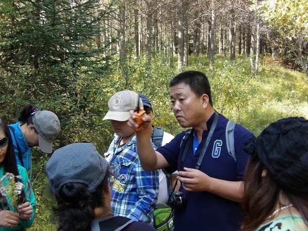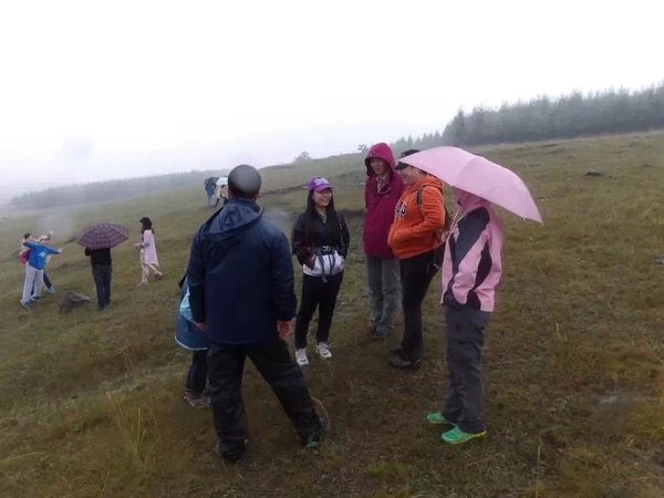 中途休息,老大给旅游们讲解户外装备知识