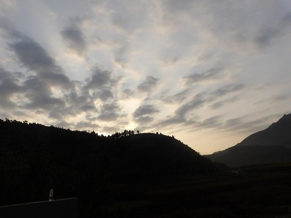 雨不大,大约过了十分钟就停了,微风拂面,沁人心脾。虽然天空渐渐明朗,但是阳光一直被一团厚厚黑云包裹着始终没能冲破云层,最后害羞的渐渐落下西山,因此我们要加快脚步前进。