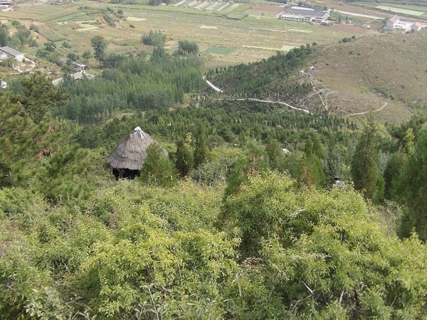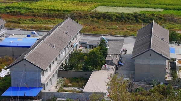 在山上俯瞰长城砖垒的猪圈和房屋