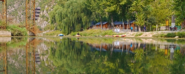 清澈见底的白羊河水缓缓地流淌,流动的河水,倒映着岸边的垂柳,再加上崇山峻岭中蜿蜒曲折的长城,构成了一幅完美无缺的画卷。置身此地令人心旷神怡。