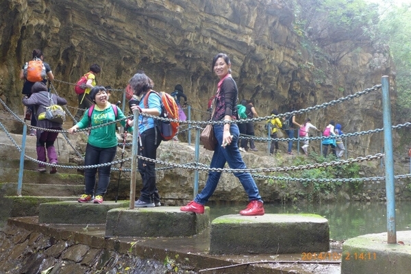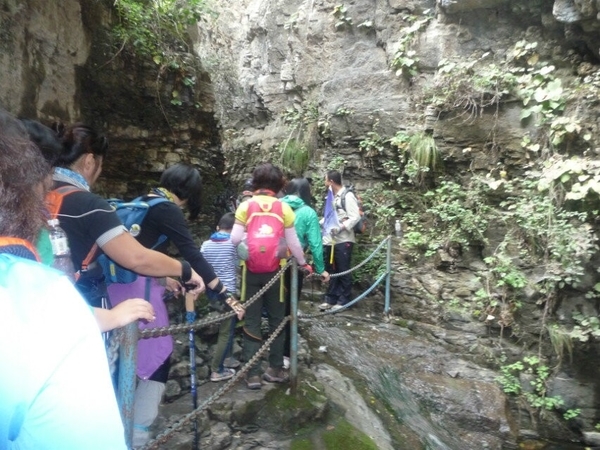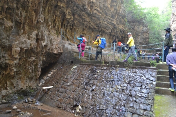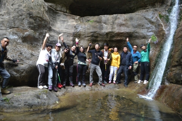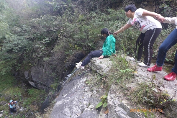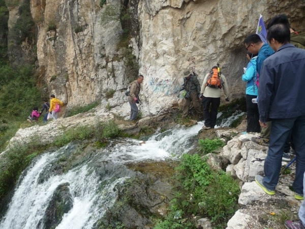洞口右侧又是一条小瀑布,水流很急,驴友们手拉着手,团结互助,感谢山岭和浪子接应大家一一渡过