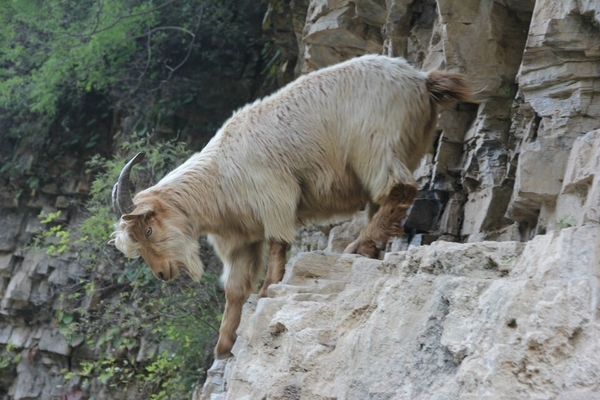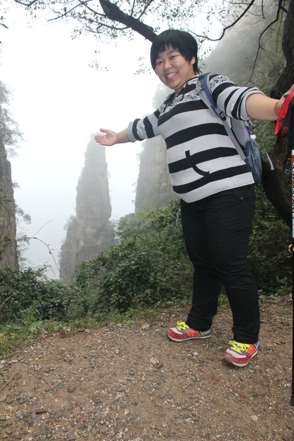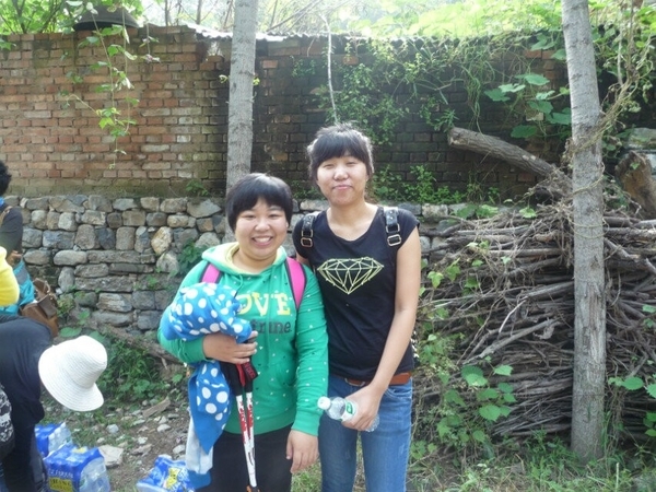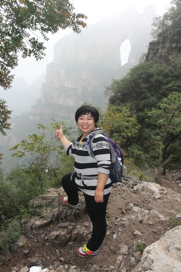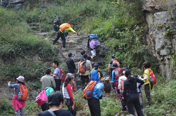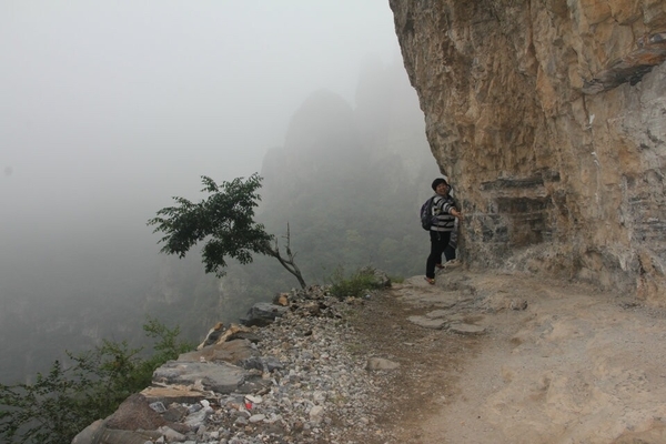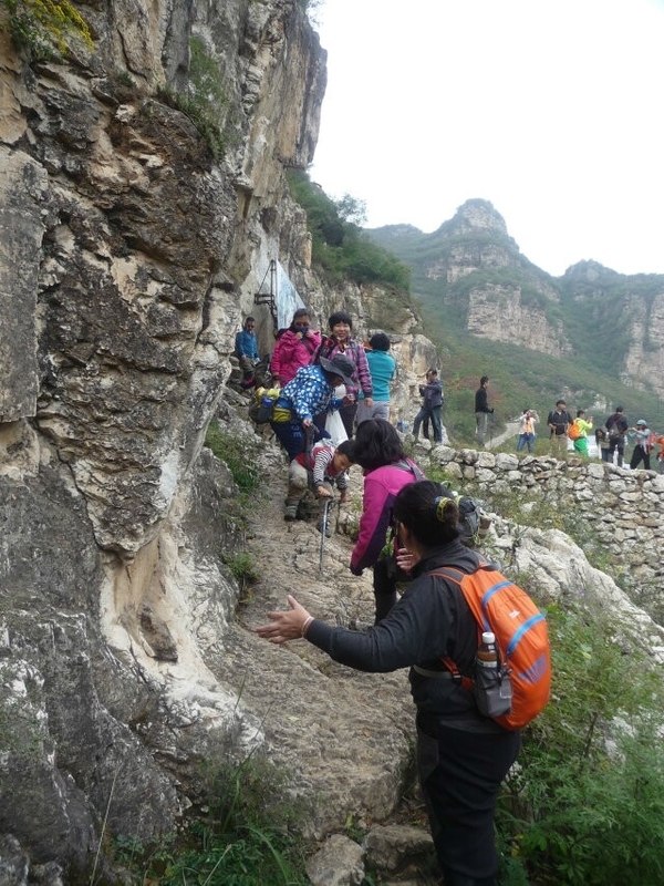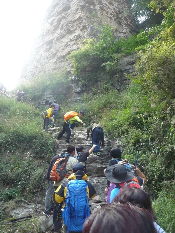 蚕姑庙的后面有一条通往山顶的小路,虽然山峰雄奇险峻,但这并不能阻止驴友探险的精神,你瞧,小灰灰不是贴着悬崖登上峰顶了么,后面的快跟上吧