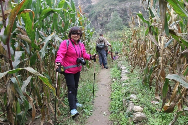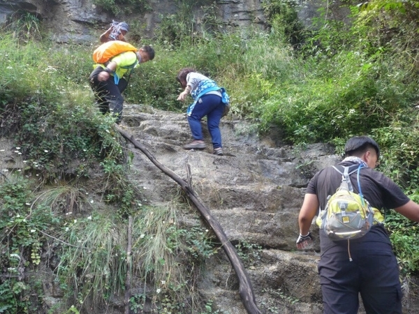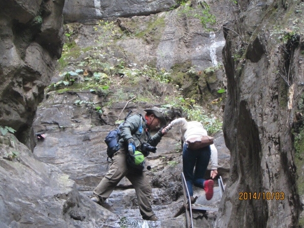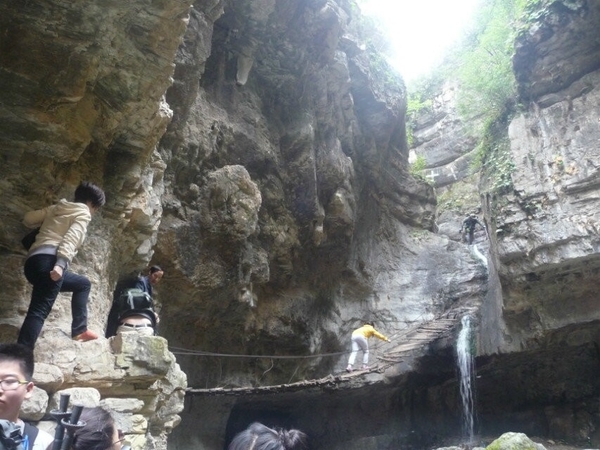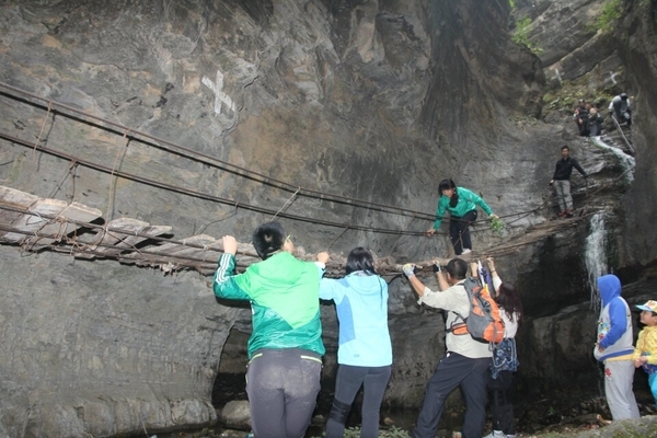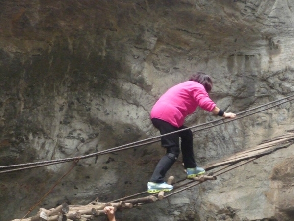 穿过玉米田进入一段沟谷,它有个好听的名字叫情进入情人谷不远处,一条帘帘飞瀑挡住了去路,涓涓细水从天而降,要想通过需上吊桥,吊桥破烂不堪,有木板的树干铺在五根有25MM的钢丝绳上,摇摇晃晃, 大家互相鼓励,安全通过了吊桥,爬上梯子翻过这座山谷犹如进入了世外桃源。