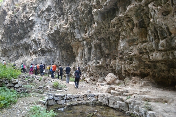 当走进第三段峡谷时,见两侧陡崖壁立冲天,崖壁的绛红色岩石状态很有特色,多属于层岩、页岩,层理清晰、齐整,因为这里还未开发,更增添了几分神秘。继续前行至最后一个上升平台,由于小路上细水潺潺,我们需要用力扒着突兀的岩石或借助杂草攀爬,每一步都很谨慎,生怕脚下打滑摔伤。在前行的路上能看见满山的羊群,有白有黑的绵羊和长角的山羊也是一道亮丽的风景。当过了羊圈以后,山势越来越陡,上山的小路湮没在灌木丛中,我们排成了字形队伍向上攀登。