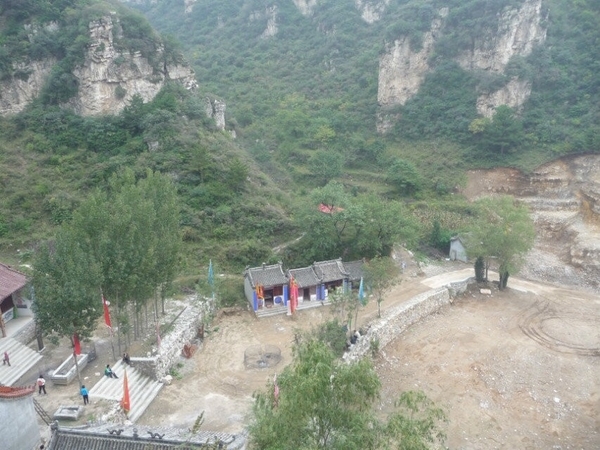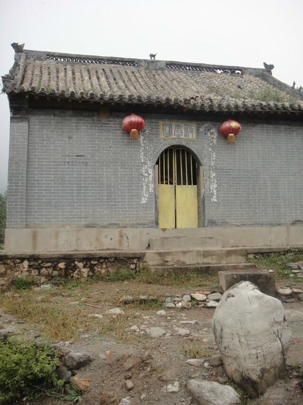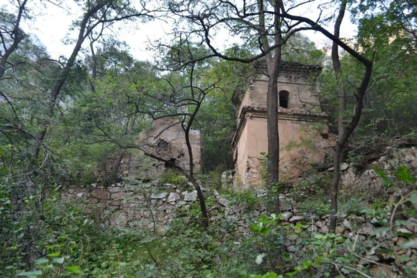 老大佐笾告诉我们,南天门北面正对着的山被一座峭壁一劈为两半,陡峭光滑,犹如一道影壁,右边是蚕姑庙,左边是老君堂。影壁顶上悬在高处的建筑就是蚕姑庙的灵峰院。在下面我们已经能够听到灵峰院的钟声了。爬过一线天,上到飞来峰,经过麒麟把门,地势越加险要。有一条小路直通蚕姑庙,第一个保存完好的四合院式庙宇建筑就是灵峰院,南北两座碑楼正对着南天门,中间却隔着深不见底的峡谷。西面的庙里供奉着蚕姑圣母,雕塑和壁画都很不错。灵峰院北面还有几个小院儿,只是保存都不太完整了。断壁残垣间,多有秦砖汉瓦,偶见残碑石鼓,令人顿生苍凉之感。
