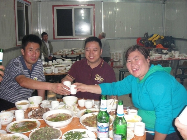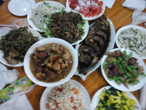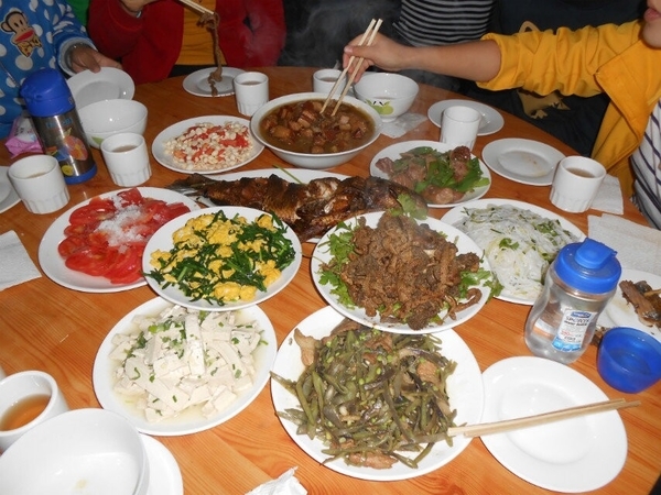晚餐为十二个菜 主菜有每桌一只野生柴鸡 野生鱼 大锅炖排骨 红烧肉,面对丰盛的晚饭大家才觉得早已饿的饥肠咕噜,瞧瞧这吃相不就说明了一切。