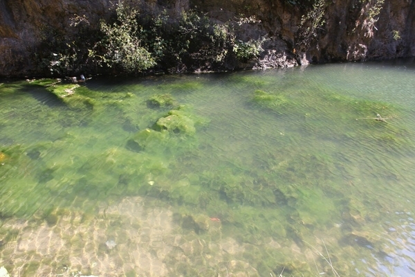 过了一线天继续蜿蜒于峡谷中,羊肠小道的旁边,飞瀑深潭错落其间,水质清澈,静静流淌过来的小溪,弯弯曲曲的掩映在石块及青草间,在阳光下像光芒四溢的水晶,又像一串美妙的音符淌过耳畔,我们经不住它的诱惑,在并不饥渴中还是饮了几口山泉水,清凉中透着几丝甘甜。有水的地方总是有那么一种灵气,让人不由自主地去爱它、亲近它。