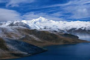 羊卓雍措,西藏三大圣湖之一,是喜马拉雅山脉最大的内陆湖。集雪山、草地、湖泊、冰川等景观为一体,湖面颜色随日照的变化而变化,湖光山色冠绝青藏高原。四季湖面呈现不同的蓝色。