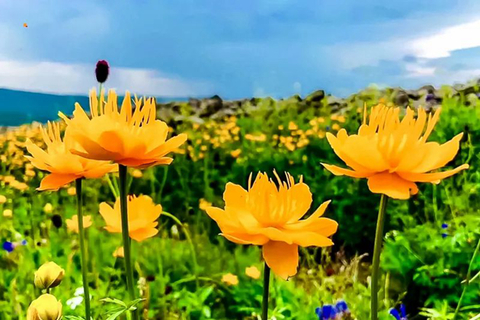 沿着山路一路盘旋,能看见高山中不一样的景色,白色的大风车,雨后云海,漫山遍野闪亮的金莲花,成群的山羊,山清水秀风光旖旎